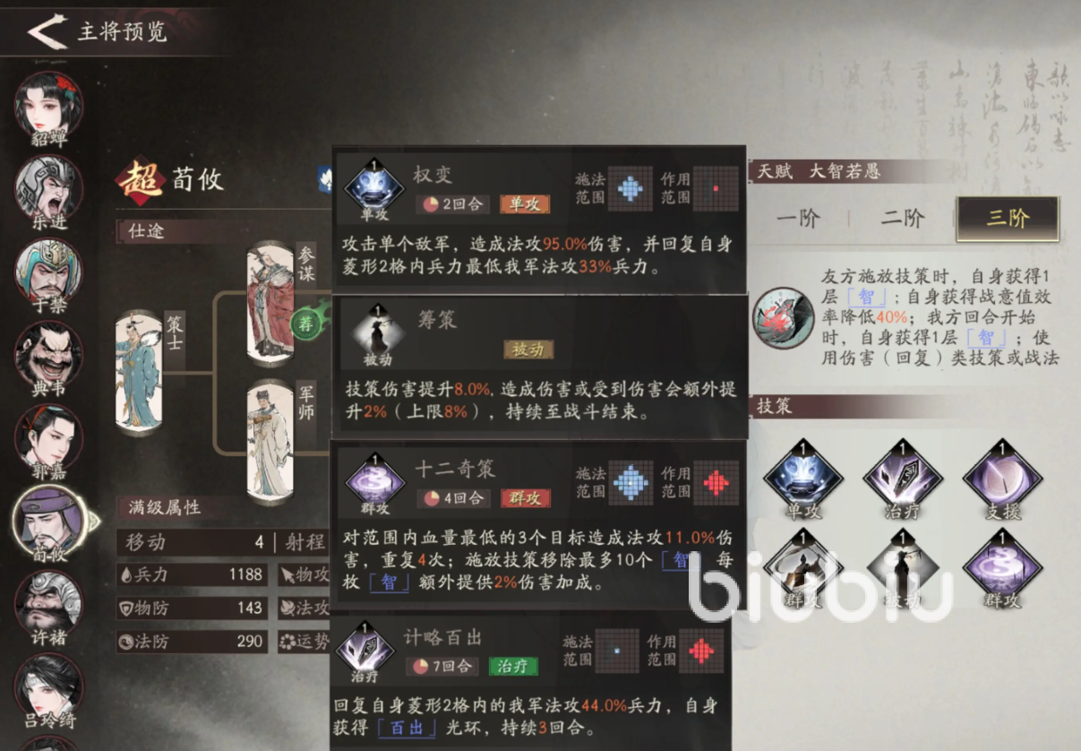 荀攸的分支上推荐选择兵种伤害更高的谋主,技能搭配有常规流和核爆流两种,常规流前期携带权变和抚宁内外,后期再加上一个十二奇策,权变能在攻击单个敌人时造成95%伤害并回复棱形范围内兵力最低的我军兵力。