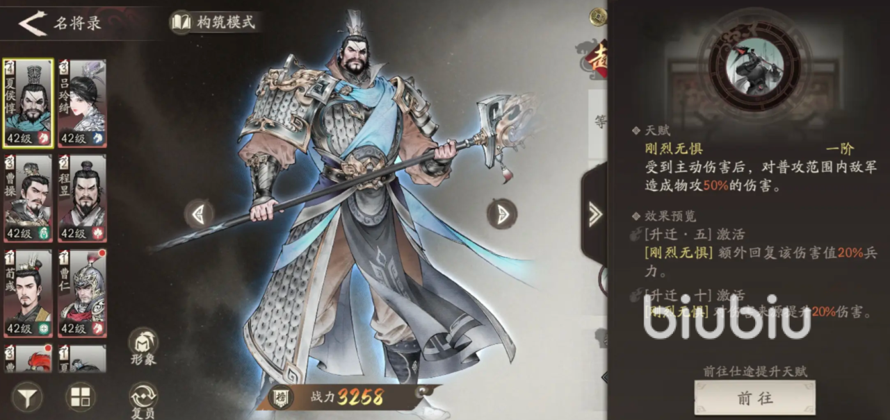 力战能在遭受伤害时提升物攻物防,忠勇义烈能对目标敌人造成130%伤害,若目标单位直接阵亡,还会对范围内血量最低的敌人造成60%追击伤,该效果可以触发2次,最后副将推荐带增加物攻的曹昂。