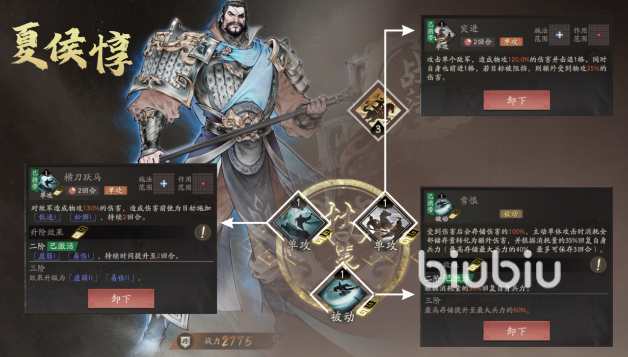 “雪恨”会在遭受伤害后存储,并在主动攻击时消耗存储量造成额外伤害,同时根据消耗量35%来回血,这能有效提升夏侯惇的生存能力,40级之后推荐把“突进”、“雪恨”,更换成“力战”以及“忠勇义烈”。