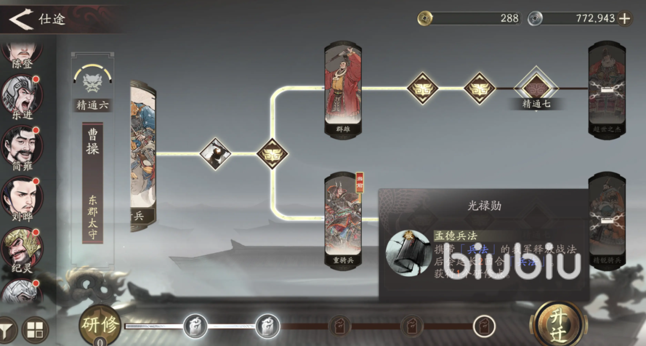 曹操是目前唯一带有光环技的武将,能让菱形2格内的武将技和战法增伤,他的天赋是在战斗开始时给所有队友赋予持续3回合的“兵法”,升迁到满阶后,还会延长2回合总共5回合,兵法能让法防、物防、物攻、法攻加15%,是十分全面且强的增益。