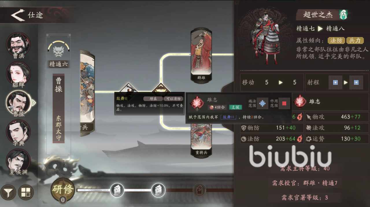 养曹操建议2条仕途线都解锁激活,因为增益技大多群雄线,光环技在重骑兵线,这些都比较关键,全部获得后因为只能带3个技策上阵,所以推荐带2个增益、1个光环来主打辅助,如挥鞭、雄志加天下的搭配就很不错。