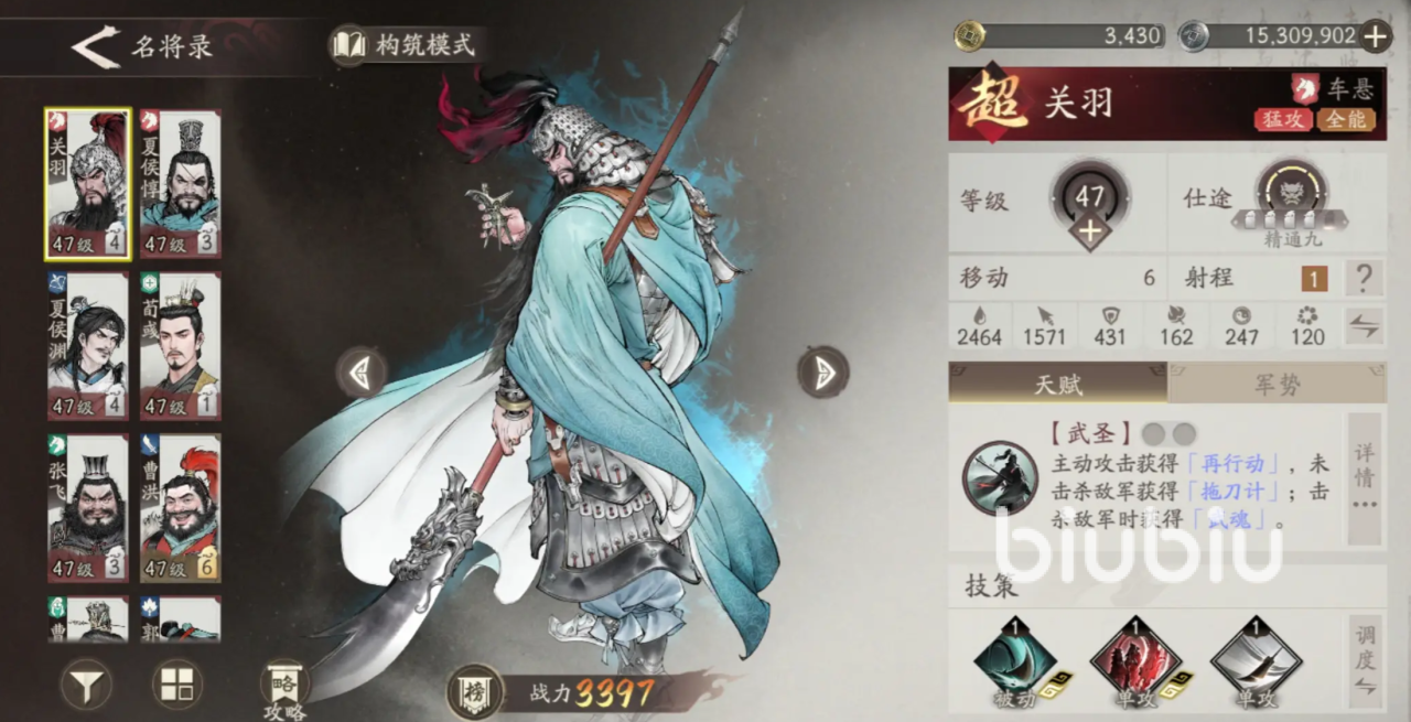 关羽:作为超品刺客类型的骑兵,他能够实现攻防兼备。对于关羽来说,在施展主动技能的时候,可以对目标造成物理伤害,并且还能够直接穿透多个目标,最终可以实现成功效果加强。如果施展了被动技能,那么也能够让敌人松懈,此时在施展主动技能搭配合理之后,就能够扭转整个战斗的局面。