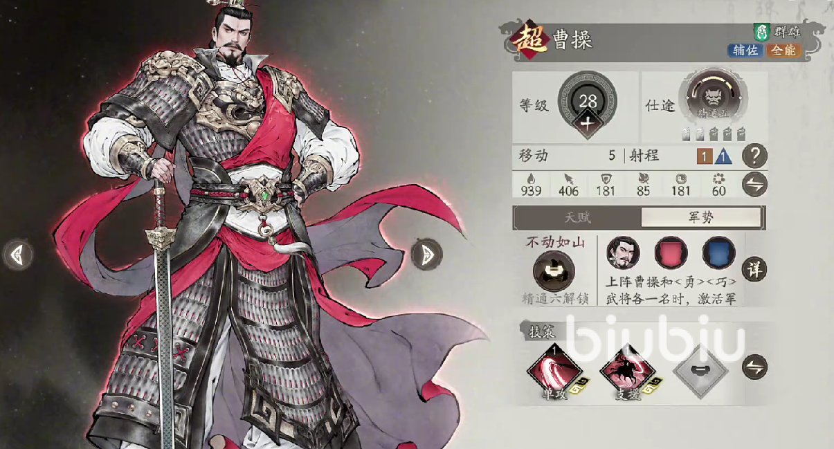 曹操:作为整个队伍的统帅,能够实现团队增益。在战斗的时候,可以帮助全体的武将获得15%的攻防加成,也能够释放战法,这样的话能够有效的延长战斗的效果。正是因为他在整个团队阵容当中作为基石,所有的战斗他其实都能够上场,并且还能够发挥出不错的实力。玩家如果在培养的时候可以直接选择曹操,毕竟他一旦恢复战意之后,将会对敌人造成高额的伤害。