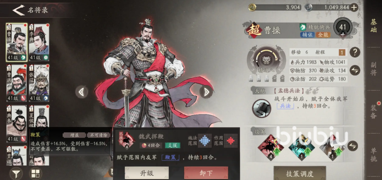 曹操是其中一个具有输出潜力,同时辅助能力非常出色的武将,在初期时可作为副C使用,两个核心技能也是具有相当不错的伤害加成的,尤其是“魏武挥鞭”,实用性很高,前期战斗,一直到后续成型都可持续使用,30级之后的他开始转型,60技基本就是队伍中的核心辅助了。