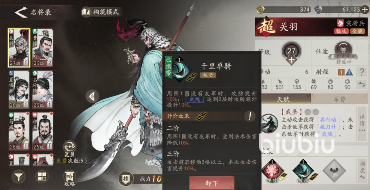 为击杀也可以施加上不能进行普攻的缴械效果,升阶后如果成杀敌并且自身拥有2层武魂的话,会直接清空掉冷却,满级后还可以根据战前移动来增加最多15%的输出,他的“单骑”会在自己周边一圈没有队友时,提升10%攻防,武魂到两层的话攻防提升效果翻倍。