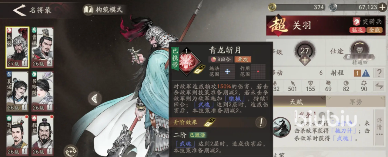 升5阶后武魂能叠3层,并且提升对高血量敌人的伤害,升10阶能在开局的时候直接得到两层武魂,由于关羽的技能大多都会和武魂联动,因此大家升到满命强度会有很大的提升,他的核心技“青龙斩月”会对敌军造成150%物攻伤害,成功击杀敌人能减少2回合冷却。