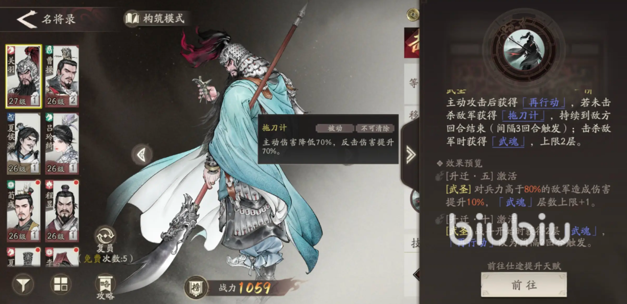 关羽的天赋“武圣”是在主动攻击后会触发再行动效果,若本次攻击没把敌人击杀会得到拖刀计,该效果虽然会减主动伤但也会提高反击伤,若将敌人给成功击杀掉会获得武魂,这能带来5%增伤减伤可以叠加2层。