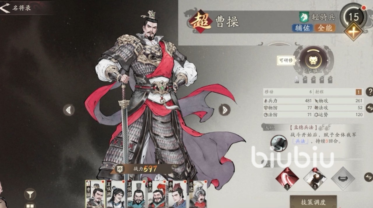 推荐三:曹操,作为开局即送的主角,曹操的辅助能力极为出色,能为全队带来强大的增益效果,同时自身也具备不俗的输出,可作为辅助或副C培养。其天赋能在开战时为全体友方附加 “兵法” 效果,大幅提升各项攻防属性,是当前版本唯一拥有光环技能的角色,其强度不言而喻,升级难度是比较低的,对于新手挺友好,培养的上限很高。