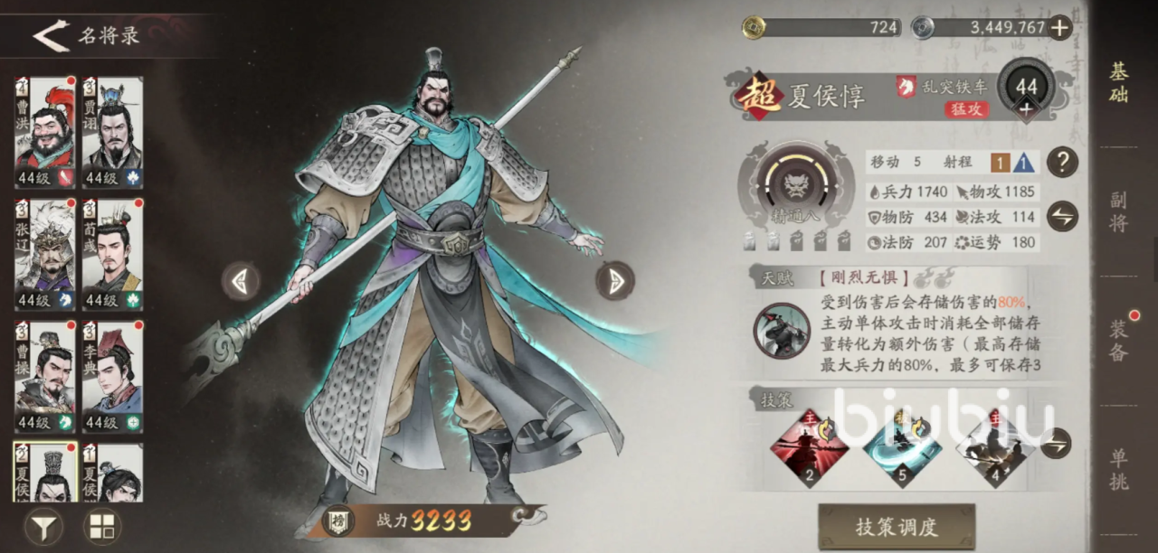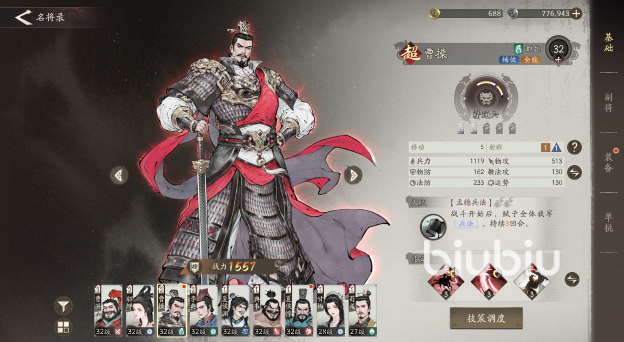 曹操是非常典型的泛用型全能武将,也是主线战役中一定要携带的武将,只要跟着主线节奏走,将他培养满是毫无压力的,作为战术指挥核心,他的主要价值就在“群体增益”+“战术联动”上面,能通过技能压制敌方阵型,还能给己方队友带来buff加成效果。核心技能”短歌行”,不仅能造成非常可观的范围伤害,更是能给全体队友附加“建安风骨”buff,且开局自带兵法也有加成,能压血线,也能提升士气,只要卡号狭窄地形使用,控制伤害效果会非常顶。他的战法也是核心输出手段,能指挥骑兵单位进行直线突袭,对单体造成高额的溅射伤害。