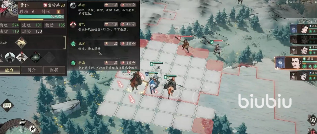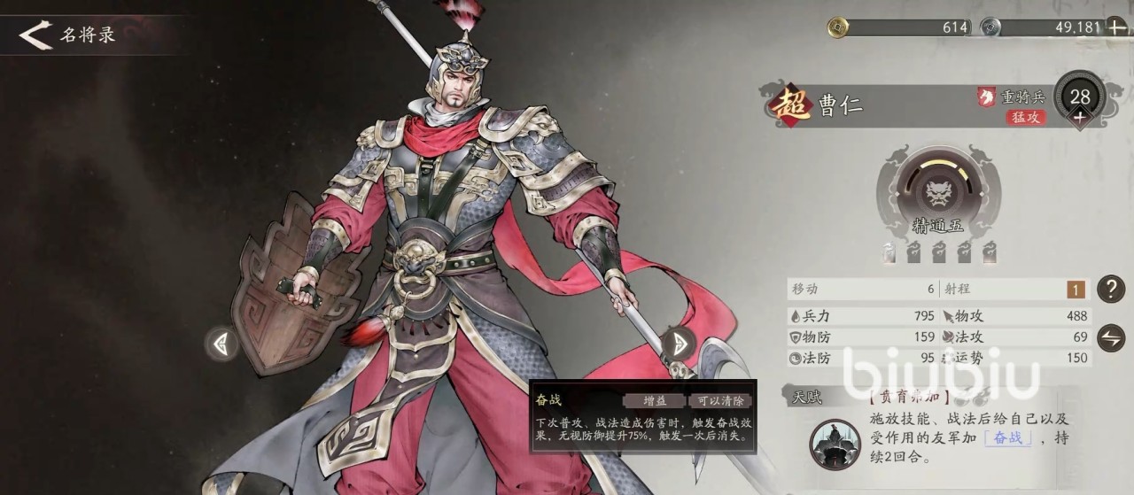 首先,小编来为大家介绍一下曹仁,曹仁是新手池必出的角色,可作为前期过渡阵容的辅助位,培养难度低,容易获取。其被动技能可让自己在打出伤害之后恢复兵力,天赋奋战更是可以直接无视敌方的防御效果。同时他还有着坦克的功能,施展技能后可让敌方的所有成员和军队都获得护盾,抵挡来自敌方的爆发伤害。无论是 PVE 推图还是 PVP 对战,都是值得使用的一位角色,因此对于愿意投入少量资源的玩家来说,性价比真的蛮高的。