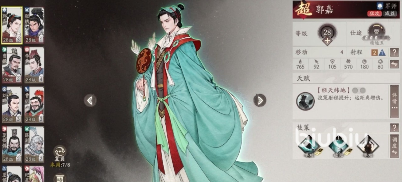 接着,就来讲一讲郭嘉,作为本游戏中策略系天花板之一,他确实是一位极具战略价值的谋略型武将,适合当作队伍的核心输出或辅助控场角色。该英雄的主动技能可以对敌方全体造成高额谋略伤害,并附加降低攻击力、防御力等负面效果,适合清场或削弱敌方整体战力。被动技能 “智计百出” 可以不断提升自身谋略攻击和谋略防御,增强输出和生存能力。与荀彧同时上场的话,还能提升两人谋略攻击,形成强力法术输出组合。