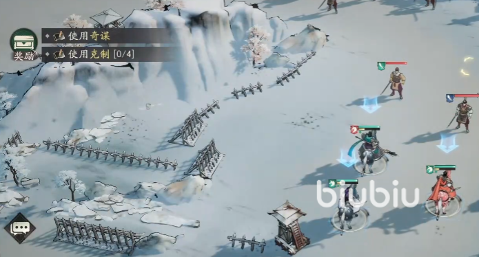 本关的地图很大,但其实主要战场很小,左边地盘是不需要去管的,比较特别需要关注的是最右边的奖励,这需要我们克制四次以及使用奇谋,开局大家可以直接使用“一鼓作气”奇谋,这个能给所有己方成员加上战意,在开局就可以放出战法,而克制我们只要用上面推荐武将就能打出。