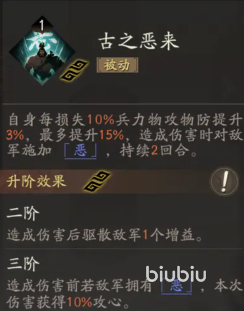 他的核心技为“古之恶来”和“折冲御敌”,前者的效果为自身血量越低,攻防就越高最多能提升15%,自身造成伤害时会给敌人施加攻防降低10%的“恶”,升级后能额外驱散敌人的一个增益,且如果目标身上带有恶,能获取10%吸血完美适配天赋效果。