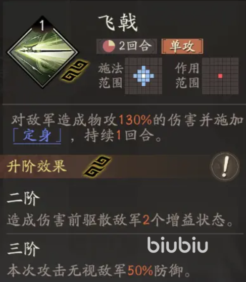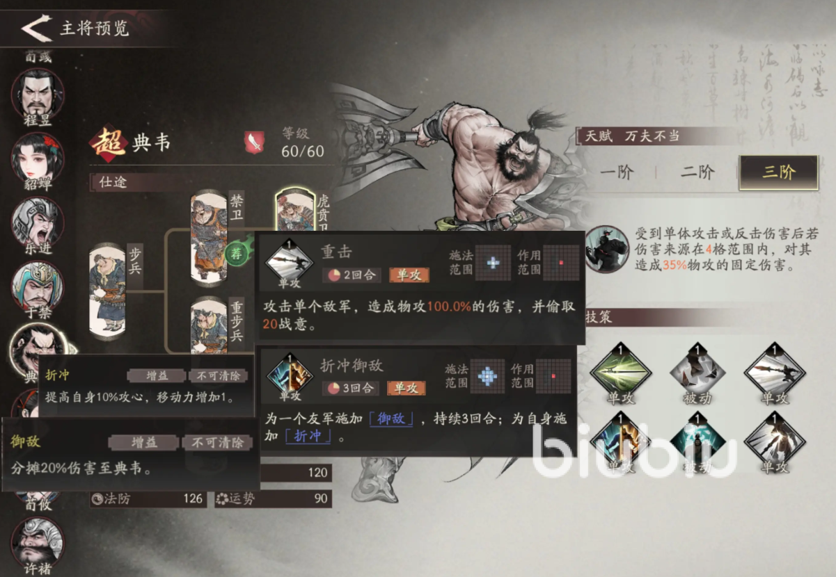 后者“折冲御敌”是不错的支援技,可以给队友分摊20%伤害,并且提升自己1点移动力和10%吸血,升级后放技能会获得继续行动,且给队友施加受到伤害降低10%的严阵效果,典韦的另一个技能“飞戟”为单体伤害,可以附加无法移动的定身效果,适合在攻击大boss时携带,一般不太能用的上。