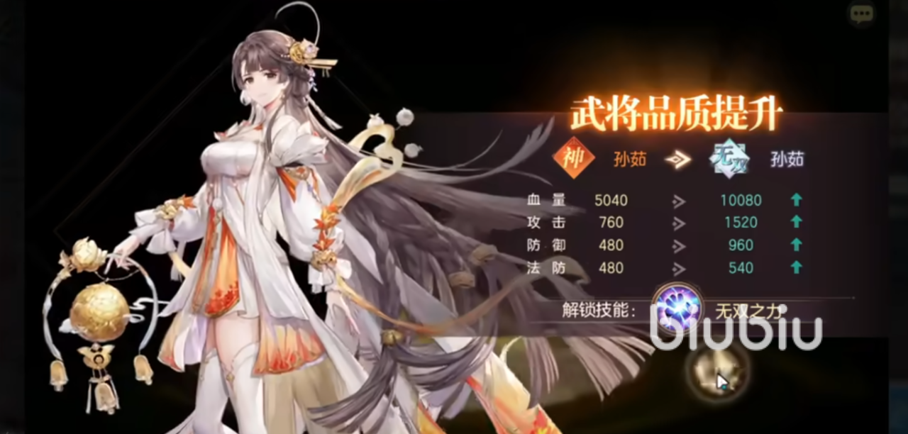 五星被动”曦魄抚尘”,对局开始时,孙茹最终抗破甲率和最终抗暴击率提高50%,任意武将在生命值低于50%时,孙茹能释放1次怒攻。觉醒无双”无双之力”,1火时,己方任意队友的忘忧消失之后,火敌方任意单位的血量少于50%,她对伤害来源打出30%生命上限的真实伤害,无视格挡和护盾,同时附加“引渡”。