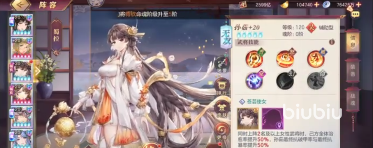 引渡的效果,在受到致命伤害后如果没被击退,就陷入不能转移的“魅惑”状态;后续的觉醒状态效果还会改变。她还有个羁绊,在同时上阵2个,或者更多数量的女性武将时,己方全体的治愈效果提高50%,她最终的抗破甲率,抗暴击率都增强50%。