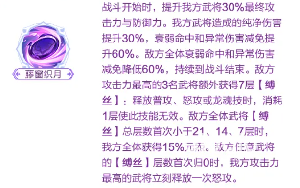 敌方攻击力最高的3位武将额外获得7层“缚丝”,效果为释放普攻、怒攻和龙魂技时,消耗掉1层使得此招无效,敌方全体武将“缚丝”层数首次少于21、14、7层时,我方全体获得15%元炁。