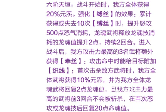 进入战斗后我方攻击力最高的3名武将额外获得“牵线”,攻击命中能给目标额外附加织线,该效果;首次击杀敌方武将时,我方全体武将获得10%元炁,并为我方全体龙魂武将回复2点龙魂值。且我方攻击力最高的武将前3回合不会被斩杀,在首次怒攻或龙魂技后回复20点命魂值。