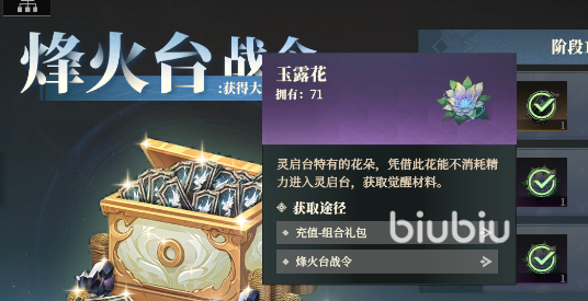 整个100层打完可以获得许多常驻抽奖券还有玉露花,这个花是用来不消耗体力刷启灵台的,可以得到觉醒材料,很多人觉醒材料本都用体力刷了,其实可以勾选用这个玉露花来刷,节省下来的体力可以全力去推主线或者刷更高阶的材料本。
