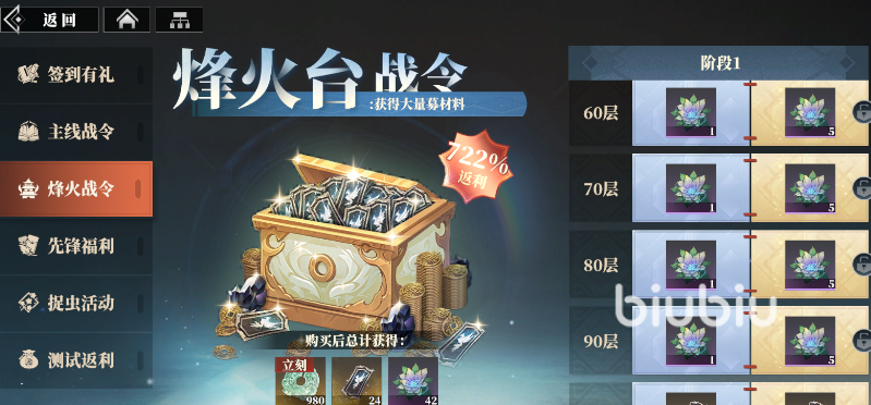 烽火战令价格是在98元,购买后可以直接获得980的三山壁,还有合计24个常驻抽和42个玉露花。当然,除了三山壁其它奖励必过不是一次性给到玩家的,需要玩家通关对应关底层数才能获得。
