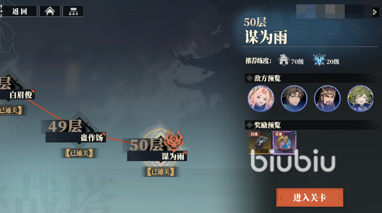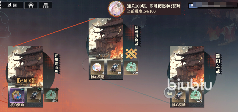 游戏里有一个试炼玩法叫做“烽火台”,可以理解成爬塔,一共有100层,每10层是一个大关,主要奖励是集中在关底的那一层,也就是通关第10、20、30等等层数的时候可以拿到主要奖励。