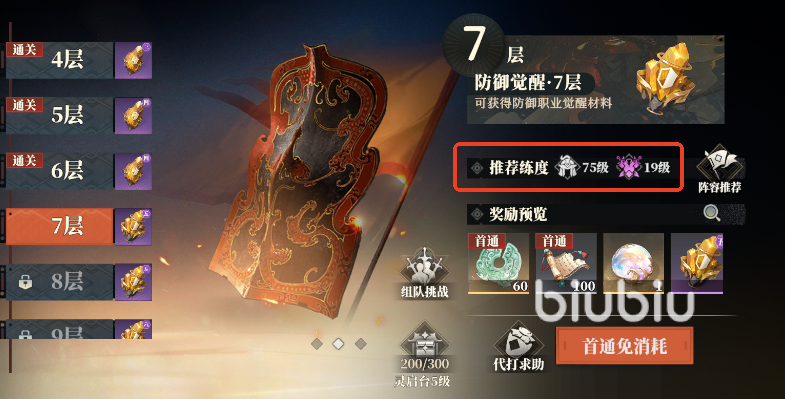 每个灵启台都有10层,层数越高可以获得更高级别的觉醒材料,当然难度也是越来越高,第一次通过新的层数是不消耗体力的,而且首通的时候也会给到一些觉醒材料、兵法、还有三山壁奖励。对应层数界面会有标记推荐的练度。