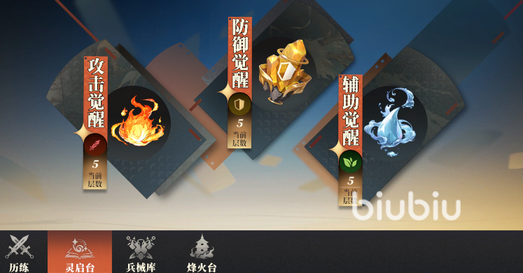 灵启台,简单来说就是刷武将觉醒材料的地方,不同的职业对应不同灵启台。目前有攻击觉醒、防御觉醒、辅助觉醒这三种灵启台,可以刷对应类型武将的觉醒材料。