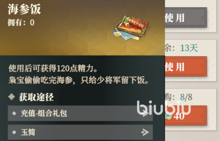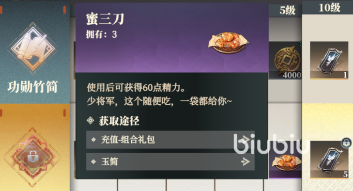 除了自然恢复外,体力恢复更快的办法就是用道具食物恢复,例如“蜜三刀”,一个可以恢复60点体力。蜜三刀主要是通过礼包、还有玉简、功勋玉简等奖励获取的。除了蜜三刀,还有海参饭,也是一样的获取途径。