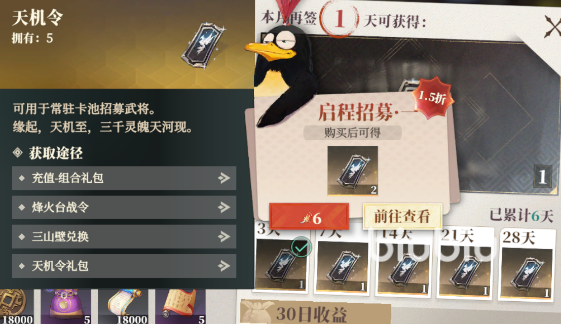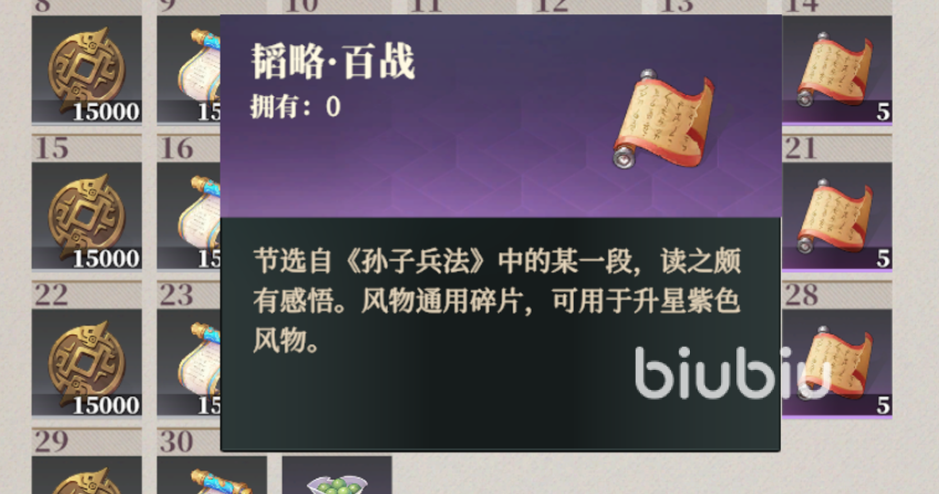 在每个月的14、21、28日还能签到获得韬略·百战,风物通用的碎片,可以用来给紫色风物升星。除了基础的签到奖励外,还有连续签到奖励,连续3/7/14/21/28天则可以分别得到1个常驻抽,合计5个。