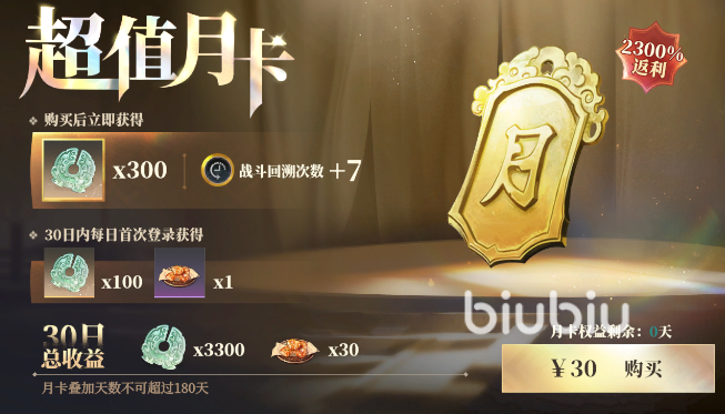 月卡可以叠加购买使用,不过最多不能叠加超过180点。除了立刻得到的300三山壁还有需要玩家每天上线登陆领取的,除了这些奖励,还有一个功能就是可以提升7次战斗回溯,长线高难的战斗,这个功能还是蛮好用的。