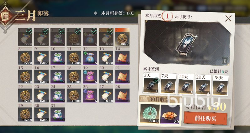 如果不小心漏签了,也不用太担心,有补签的机会,但机会次数并不是无限的。既然提到了每月签到,那么就不得不提到月卡了。每月签到搭配月卡可以得到不少的奖励,三幻2的月卡只要30元,累计可以获得3300三山壁和30分的蜜三刀(60精力食物)。