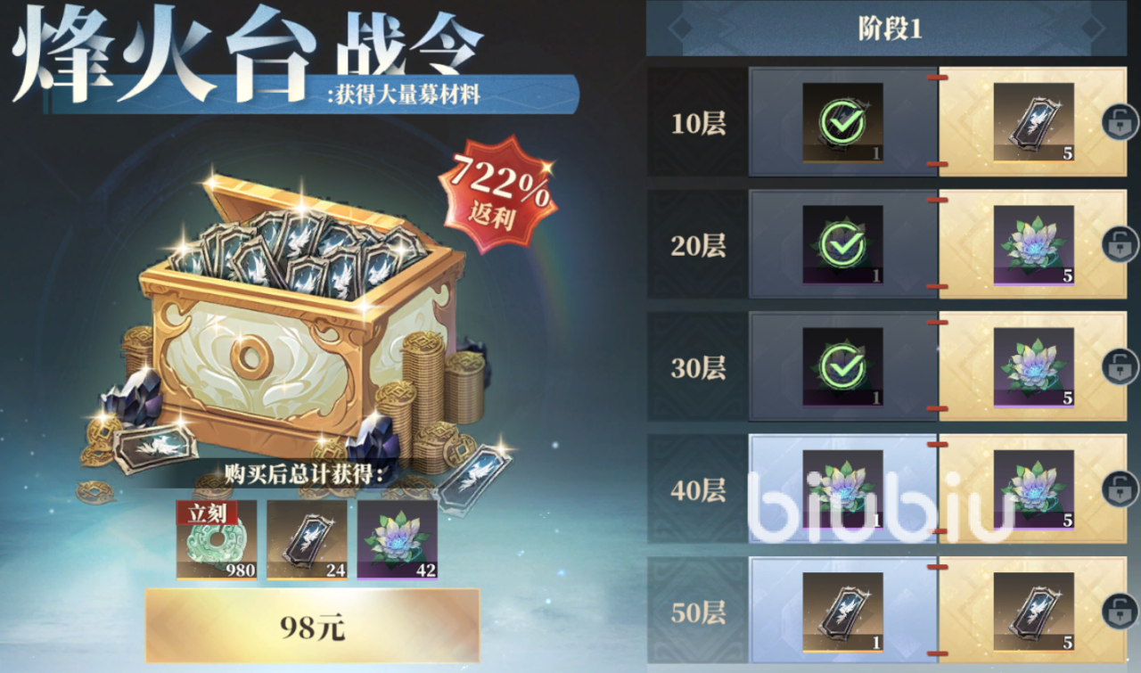 除了上面提到的外,还有98元的主线战令和同样98元的烽火战令,都可以原有奖励的基础更进一步,获得更多奖励,返利幅度也是蛮高的。想尽快将队伍培养成型的玩家可以考虑入手。