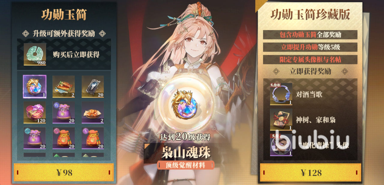 这个月卡还是超级划算的,足足有2300%的返利,是比较推荐大家购买的。配合游戏内的每月签到,还有功勋玉简(98R)或者功勋玉简珍藏版(128),能够获得更多奖励。而且功勋玉简到20级可以获得顶级的觉醒材料“枭山魂珠”。