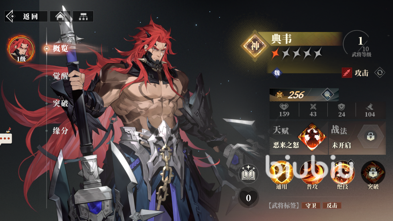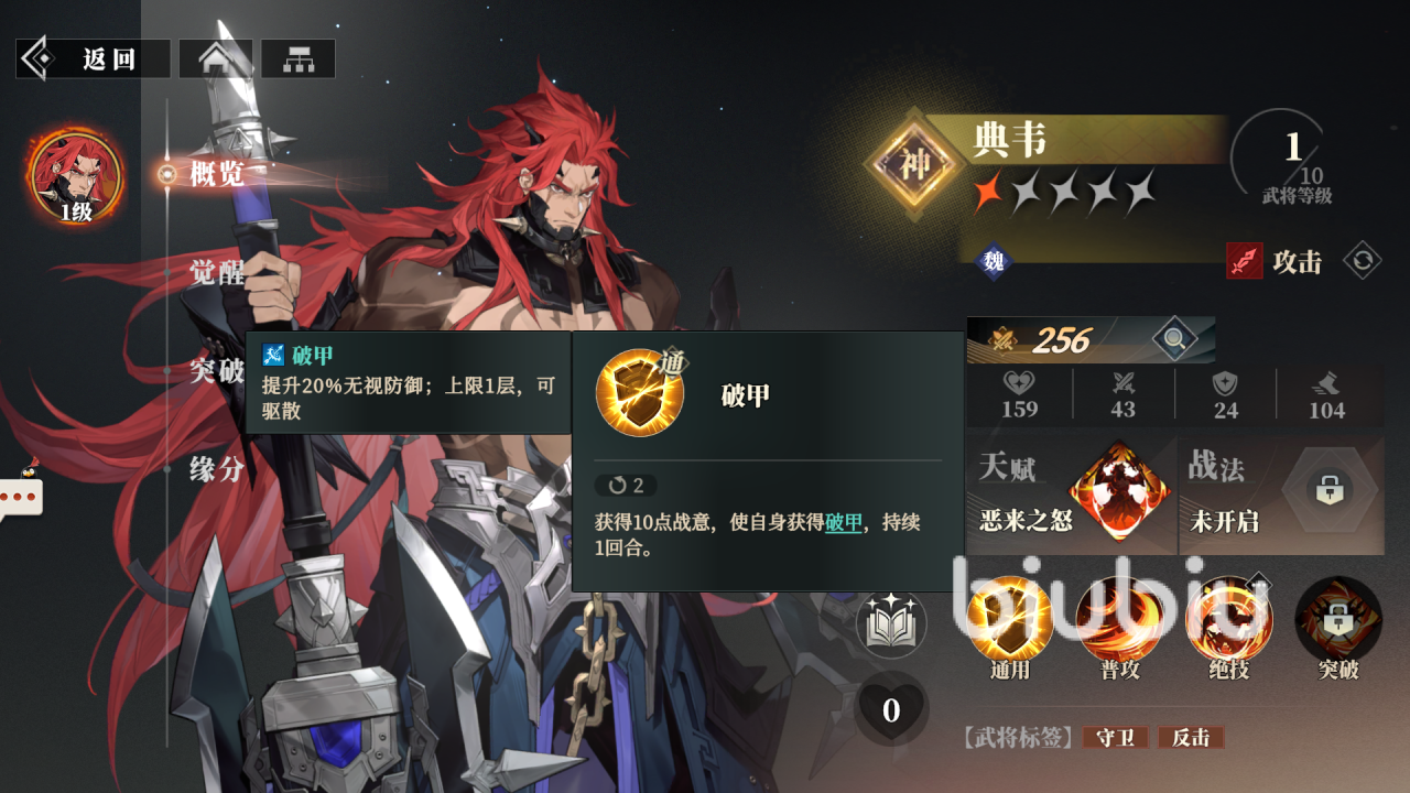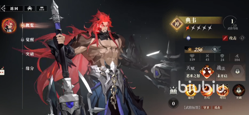 他则是一个外形比较粗狂壮硕的神品质武将,擅长打守卫和反击。通用招式“破甲”,可带来十点战意的,提高20%无视防御。普通攻击“凶煞”,对敌方前排整排造成77%的物理伤害。大招“立誓效忠”,该技能单次战斗中只能释放一次,使队友永久的获得“典韦的效忠”,效忠的友方目标受到敌方回合内造成的伤害时,典韦为其分担20%,并额外进行一次普攻,分摊过来的伤害视为衍生伤害,释放此技能之后,可释放暴起。