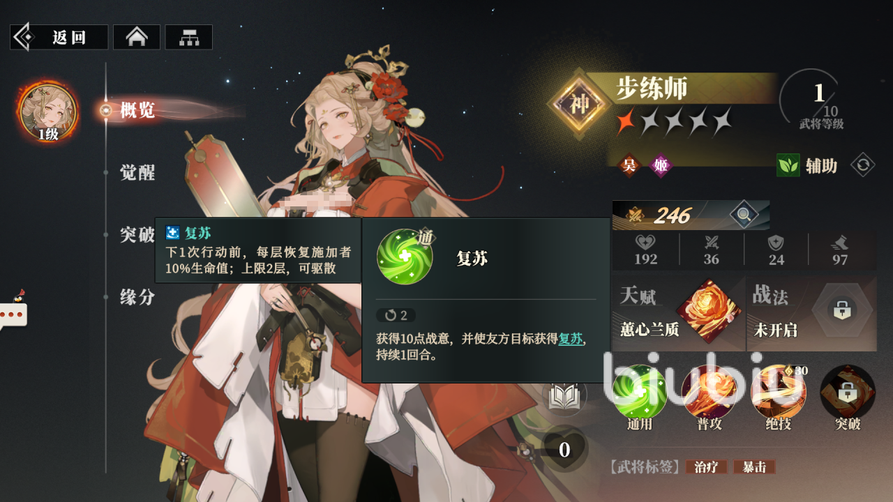 步练师是一个“神”品质的武将,虽然是一名辅助角色,但是她比较擅长给队伍提供治疗效果,有效延长续航和生存能力,同时也能提高队伍整体的暴击和输出效果。通用技能“复苏”,获取10点战意,并使友方目标获得复苏效果,在下一次行动前,每次恢复施加者10%生命值。普通攻击“雍容”,对敌方前排目标造成100%法术伤害。