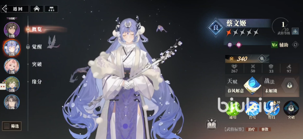 蔡文姬是一名“良”级的角色,也是治疗型的辅助。辅助的通用技能都是一致的,参考上文的即可。普攻使用后会对前排敌人打出100%法术伤害。绝技“浩於长空”,可为己方队友治疗攻击力为240%的血量,然后为其以及相邻的目标驱散一个减益效果,武将突破之后带来的效果就是治疗系数的提升,可分别提升到252%和264%。