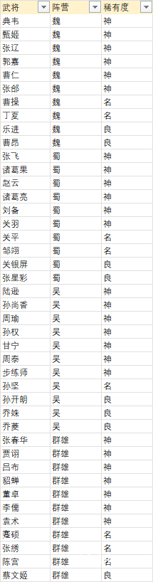 其实目前首测一共有42名武将,由于武将的数量众多,无法在单篇当中详细给大家介绍清楚每个武将,但是大家可以参考下图查看武将的阵营以及稀有度,下面主要挑选几个比较有代表性的给朋友们讲解。