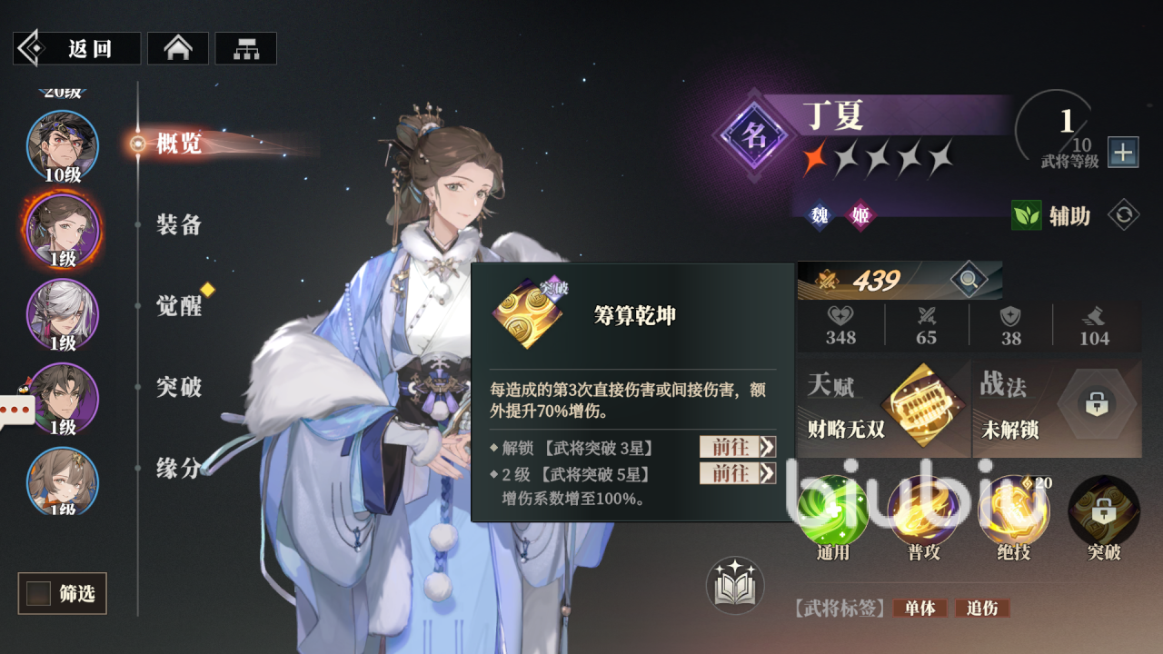 这是一名实用性比较高的辅助武将,除了对单体造成伤害外,她的辅助能力主要体现在对敌方的削弱上面,能降低敌人的伤害减免效果,同时让敌人的治愈回复效果也降低,限制了对手的回复和持续输出能力;并且还具备追伤的能力,能减少主C的输出压力。