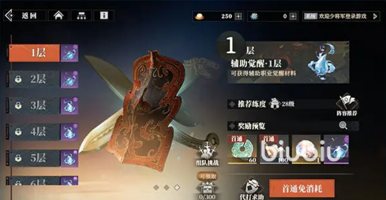 武将觉醒:武将的觉醒材料主要在“灵启台”这个玩法中获得,攻击,防御,辅助型的武将均能在对应的副本中进行挑战,挑战各有10层,通关之后能直接扫荡1-6来累积对应的材料。