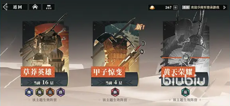 装备:武将的成长,必然离不开装备的加持,可通过“兵械库”来获取不同的装备,兵械库由三个主题,“草莽英雄”,“甲子惊变”,以及“黄天荣耀”构成,三个主题生效的阵营是不同的,其实就是三种类型的装备塔,可从其中获取橙色装备,无双装备,可将对应装备给合适的武将使用。