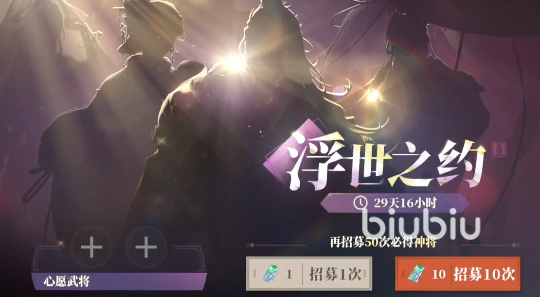 第二个池子是浮世之约,这个是心愿池。玩家们可以设置两个两位自己想要的武将,然后在50次内必定可以获取到神将,而神将也一定是所选择的心愿武将。这个池子需要的抽卡资源和其他的不一样,这点需要我们注意。