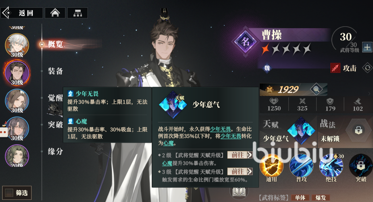 新手初始阵容推荐曹操、蔡文姬、孙开朗和甘宁,剩下两位可以根据自己新手池中抽出的橙将情况直接加上,曹操是强大的单体输出,天赋能在战斗开始时永久得到提升30%暴击率的少年无畏,生命比例首次降低到35%以下的时候还会将该效果转化成心魔,变为提升30%暴击率和30%吸血,绝技则是对敌方单体进行2段攻击,每段形成118%物理输出值,如果目标生命比例高于自身还会增加10%的伤害;