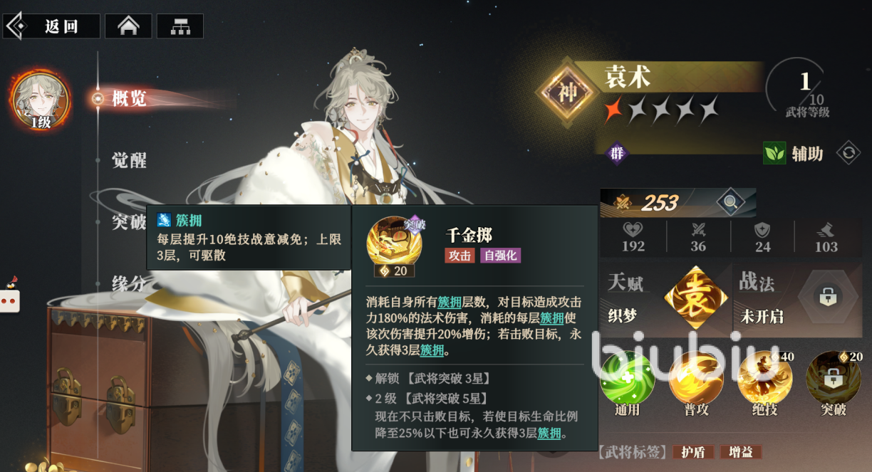 他的突破技“千金掷”会消耗自身所有的簇拥层数,对目标形成一次攻击力180%的法术伤害,消耗的每层簇拥都会让该伤害提升20%伤害,若击败掉目标则永久获得3层簇拥,突破技升到2级的时候哪怕不击败目标,只要让目标生命比例降低到25%以下,也能拥有获得3层簇拥。
