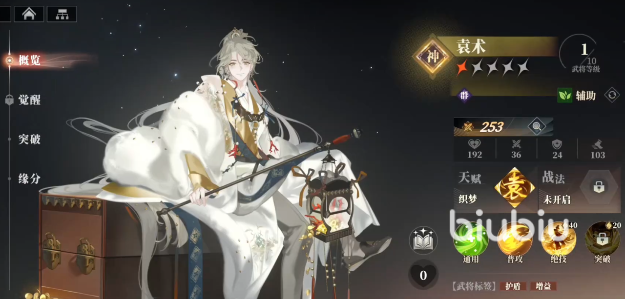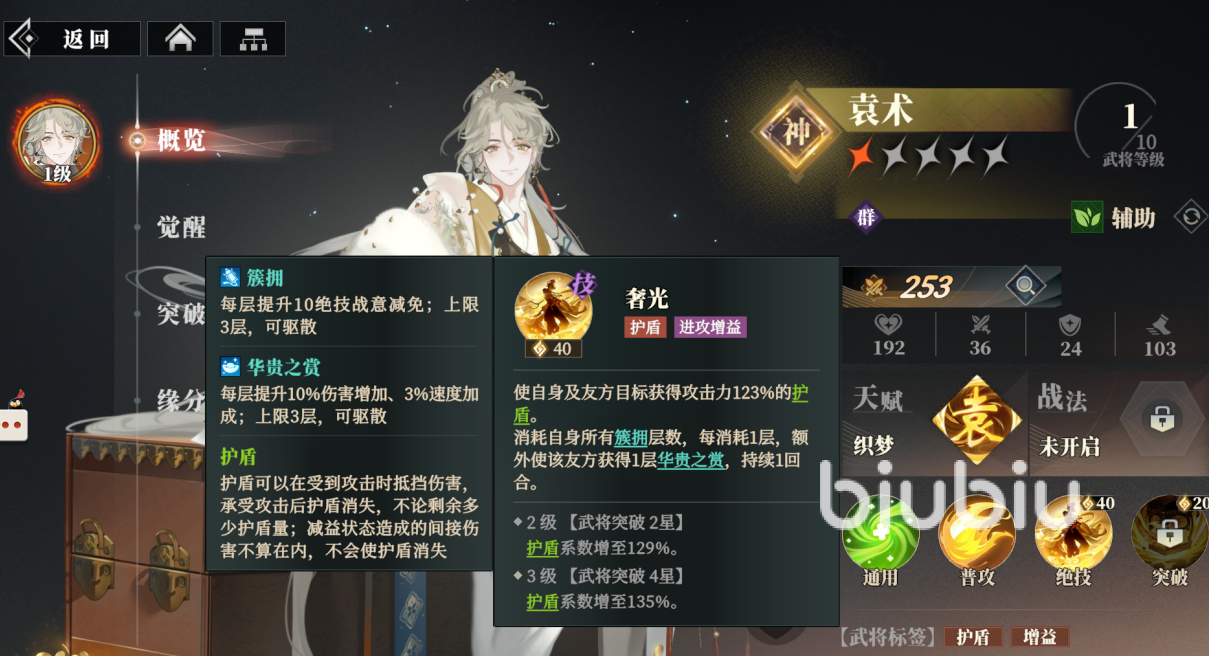 三国志幻想大陆2枭之歌袁术是一个很好用的辅助角色,他不仅能赋予队友护盾,还能增加伤害和速度,让其整体更加强力,突破技还能对单体目标形成一定伤害,只要搭配上强力输出,就能发挥出他的作用。