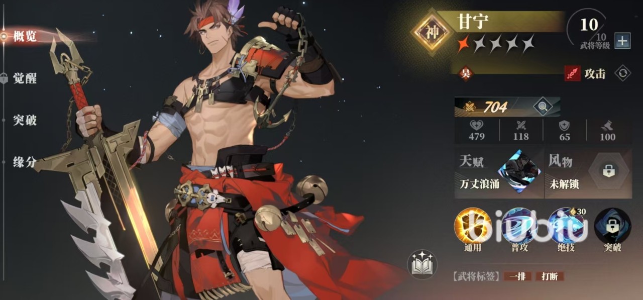 甘宁的天赋万丈浪涌,当绝技造成伤害时,可以给目标附加一层噬浪效果,当噬浪达到上限时,将所有层数消耗掉造成高额伤害。普攻可以对前排目标造成物理伤害,绝技对敌方任意一排造成高额物理伤害,并打断对方吟唱,对该排最右侧敌方目标还有50%暴击率加成。步练师的天赋蕙心兰质,在治疗时如果目标生命值较低,那么将提升治愈率,如果生命值较高,那么将使目标提升行动条。绝技霞光万丈,能够发起六段治疗,对生命值比例最低的队友进行恢复,恢复的时候还可以享受到暴击带来的加成。
