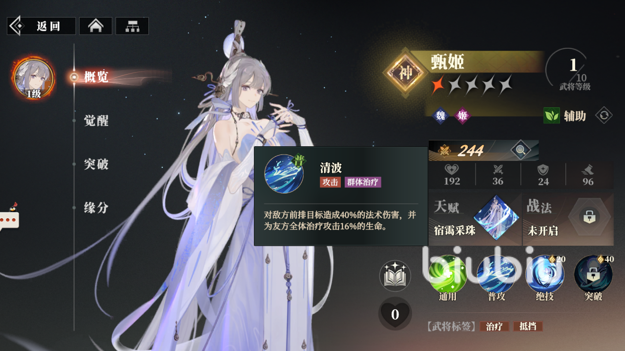 通用效果“复苏”,让她获取10点战意,并让己方队友获得复苏效果。普通攻击“清波”,会让敌方前排单位受到40%的法术伤害,并给己方全体队友展开治疗,治疗效果是自身攻击力16%的生命值。