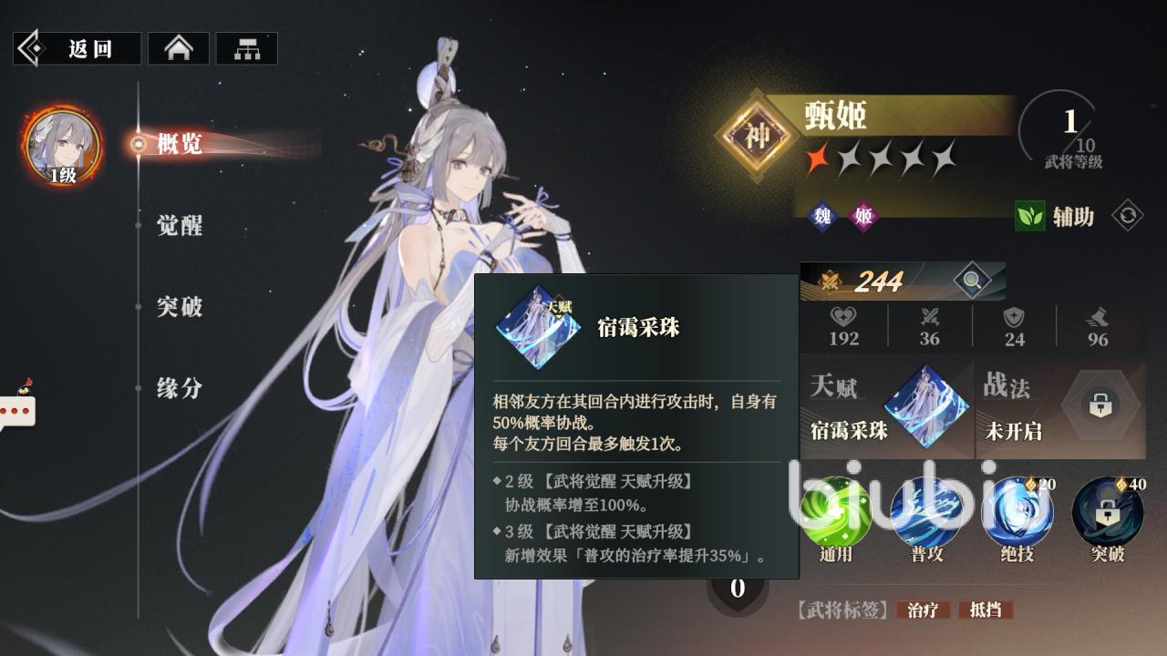 天赋效果“宿霭采珠”,当相邻的己方队友在对应的回合内展开攻击时,她自己则获得50%的几率能进行协同战斗,每个队友回合最多触发一次;武将升级后,2级时协战几率增加到100%;3级时会新增一个效果,普攻的治疗率得到35%的提升。
