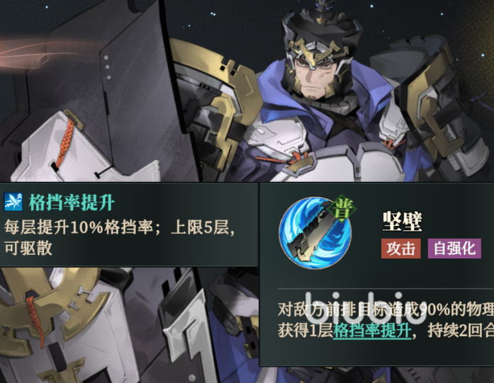 曹仁的普通攻击是坚壁,此攻击是对敌方的前排目标造成90%的物理伤害,同时可以获取到1层的格挡率提升。这个能力是每层可以获取10%的格挡率,上限是5层,可以被驱散,持续时间两个回合。