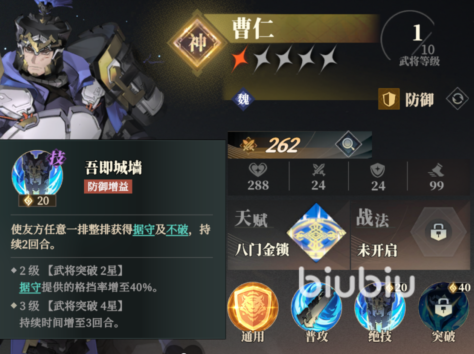 在达到3星后可以获取到固若金汤,这个技能是让友方的目标获取到固若金汤的能力。此能力是受到直接伤害的时候该次伤害不超过拥有者生命上限10%,此效果无法被驱散。2级的时候冷却减少1秒。曹仁天赋是八门金锁,战斗开始的时候施放,对于每一名友军单位来说,每有一个相邻友方都可以获取6%的免伤。2级可以增加到10%免伤。3级则是14%。