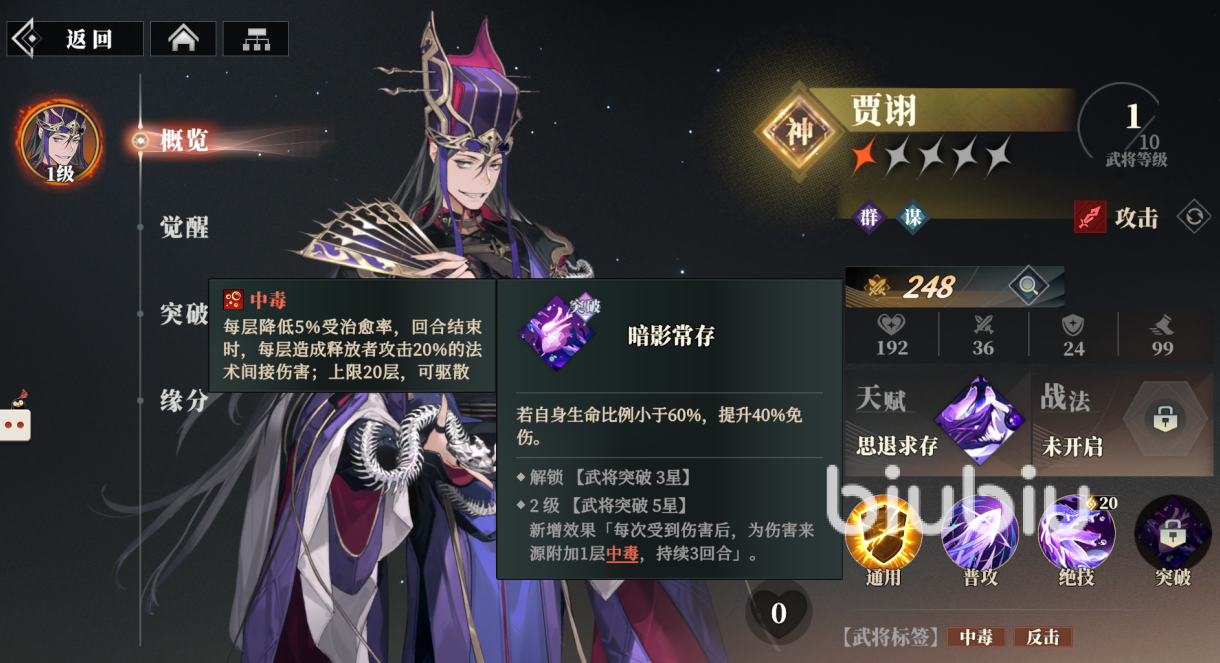 他的突破技“暗影常存”是在自身生命比例小于60%的时候,提升40%免伤,武将突破5星将该技能升到2级会新增效果,在每次受伤后,为伤害的来源附加1层持续3回合的中毒。